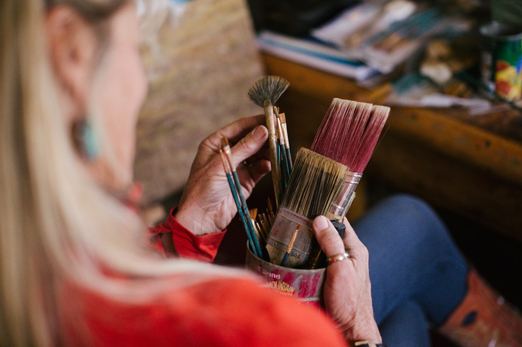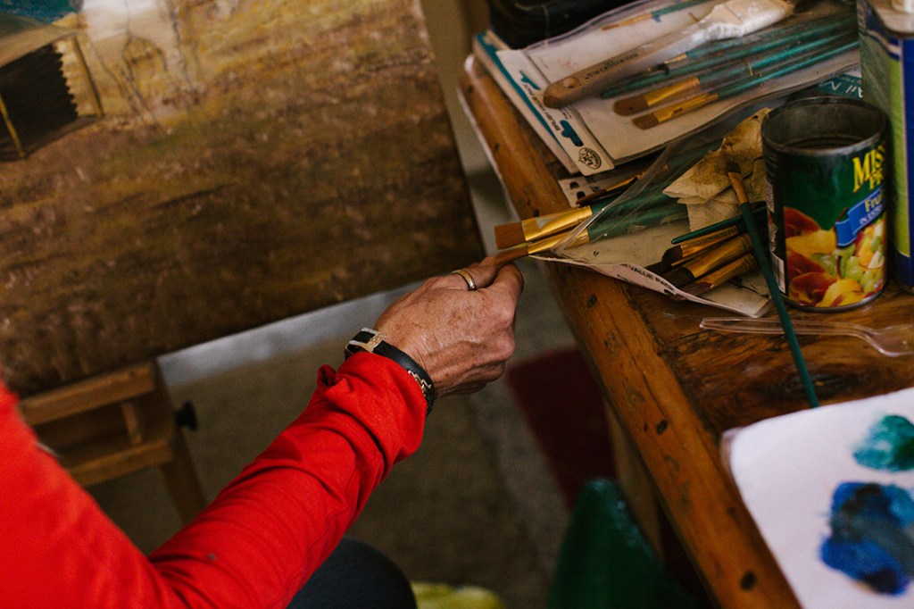 For those of you who knew Wade Collins, many great things can be said about him. When he passed, his wife Twyla asked me to design the program for his memorial service. How do you capture such a beautiful life on a folded piece of paper? I had immediately thought of an unfinished painting of two cowboys I had seen just a few weeks earlier in his studio at their cabin in the mountains. I envisioned a photo of the painting still sitting on his easel just as it had been the last time I was there. Placing that image on the backside of the program would be a perfect tribute but I would need to make the trek up to the cabin to photograph it.