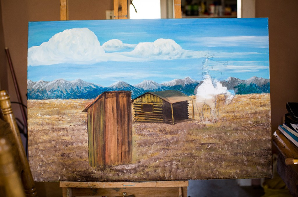 Instead, on the easel was another unfinished painting. It was Wade’s favorite thing to paint…a mountain scene with a log cabin in the valley below with an outhouse in the foreground. All of that was finished. Unfinished and off to the right of the cabin was, bigger than life, a start of a cowboy on a horse riding up into the mountains. Not yet been touched by paint, the transparent pencil drawn figures seemed to be flying up over the mountains and towards the heavens.